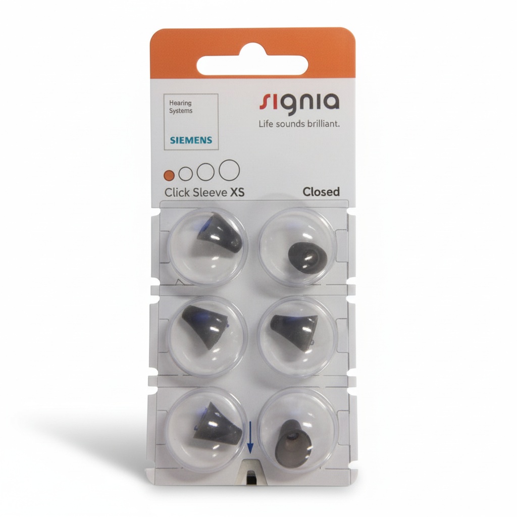 Signia Click Sleeves are domes for hearing aids that can be used with several of Signia’s hearing aids, such as Signia Silk, as well as regular in-the-ear receiver hearing aids. For Signia’s small Silk hearing aids, which are almost invisible inside the ear, the dome is placed on the hearing aid, ensuring a perfect fit for the ear canal. Furthermore, the anti-slip effect ensures that the hearing aids stay in the ear at all times. There are several versions of Signia Click Sleeves to choose from, including both an open and ventilated version.